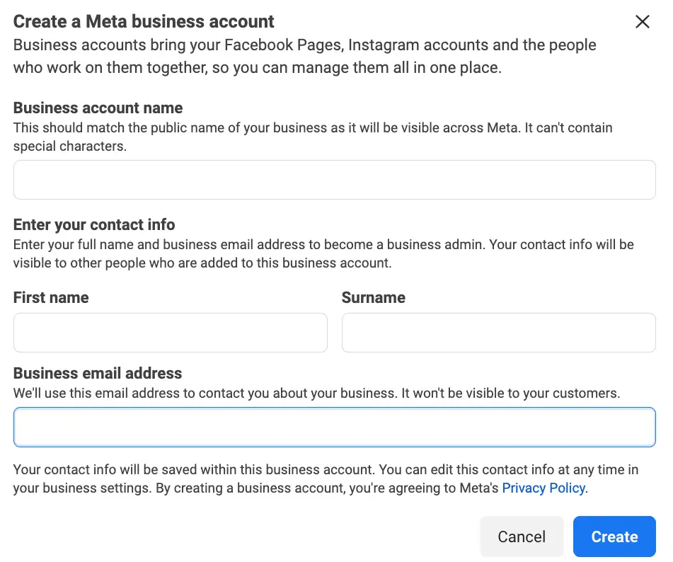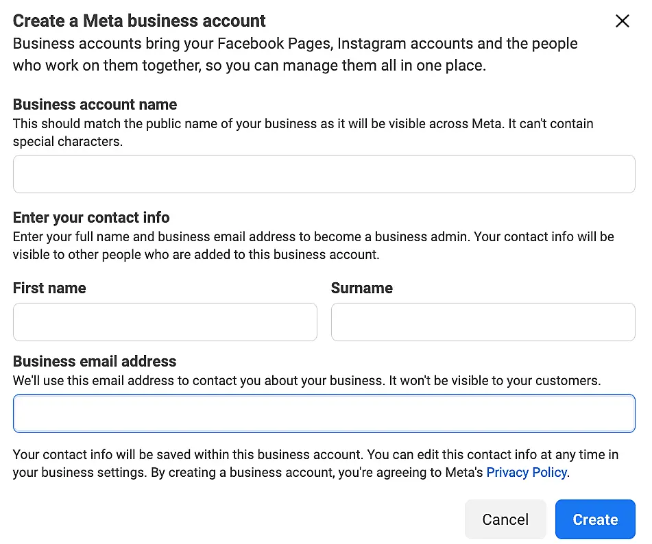 Перейдите на https://business.facebook.com/ и нажмите "Create a business portfolio". Заполните основные поля: "Название аккаунта", "Имя" и "Фамилия", "Адрес корпоративной почты".