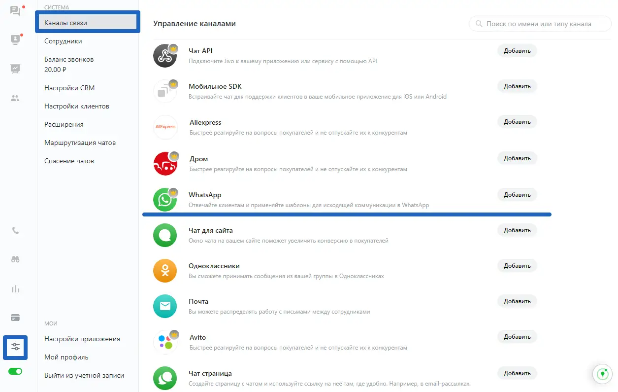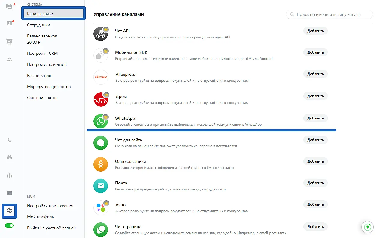 Чтобы подключить аккаунт, зайдите в приложение Jivo, раздел "Управление" > "Каналы связи" > "Добавить" справа от канала WhatsApp.