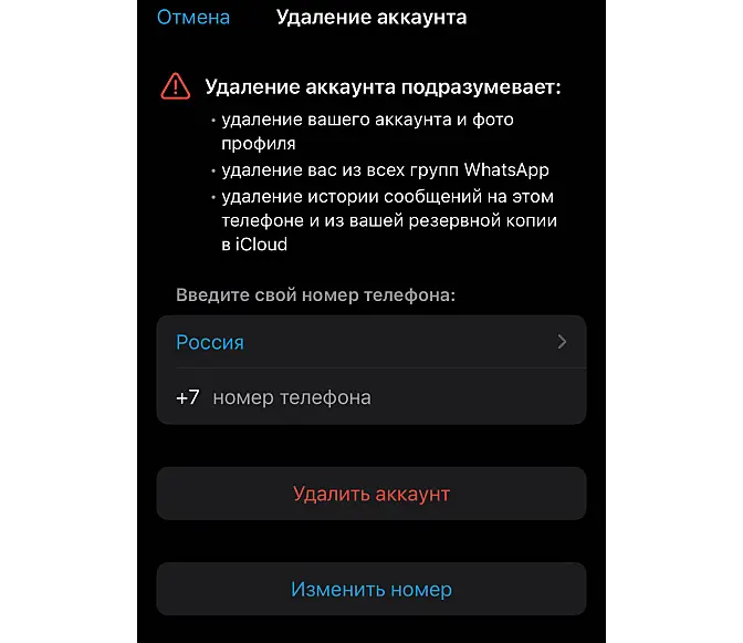 Если номер используется в другом аккаунте WhatsApp** или WhatsApp Business**, удалите его в мобильном приложении WhatsApp**. Заранее предупреждаем вас, что при таком удалении будет стерта вся история сообщений, вы покинете все группы в WhatsApp**, а также будет удален аккаунт и фото профиля.