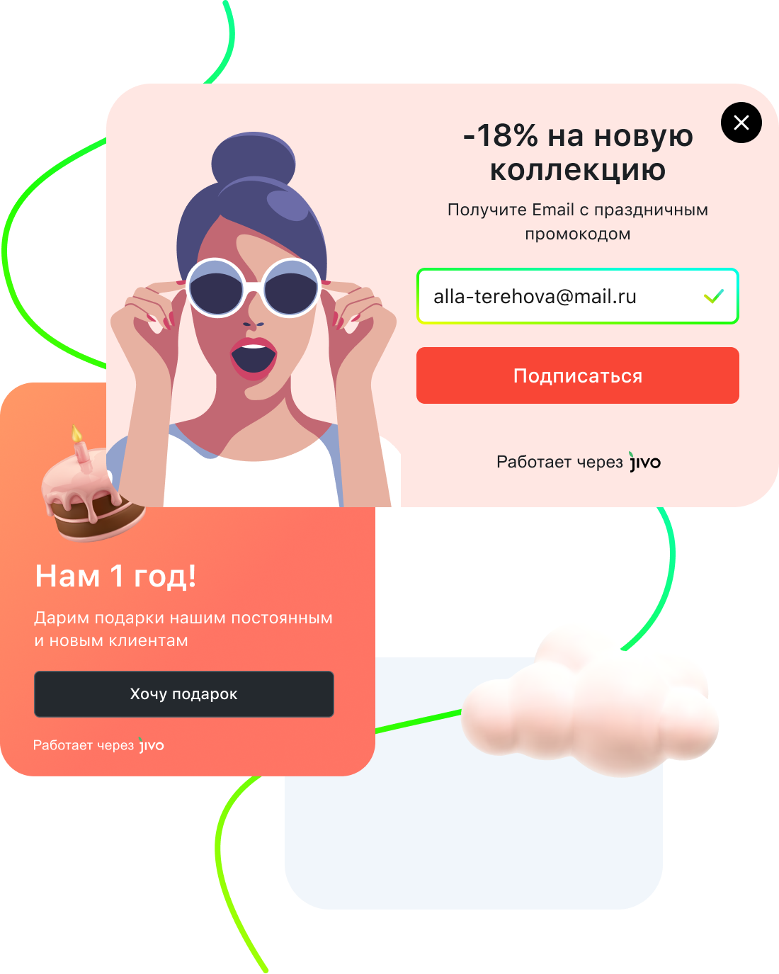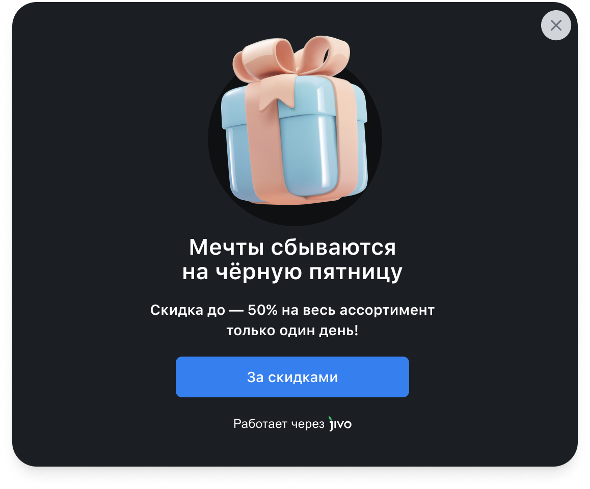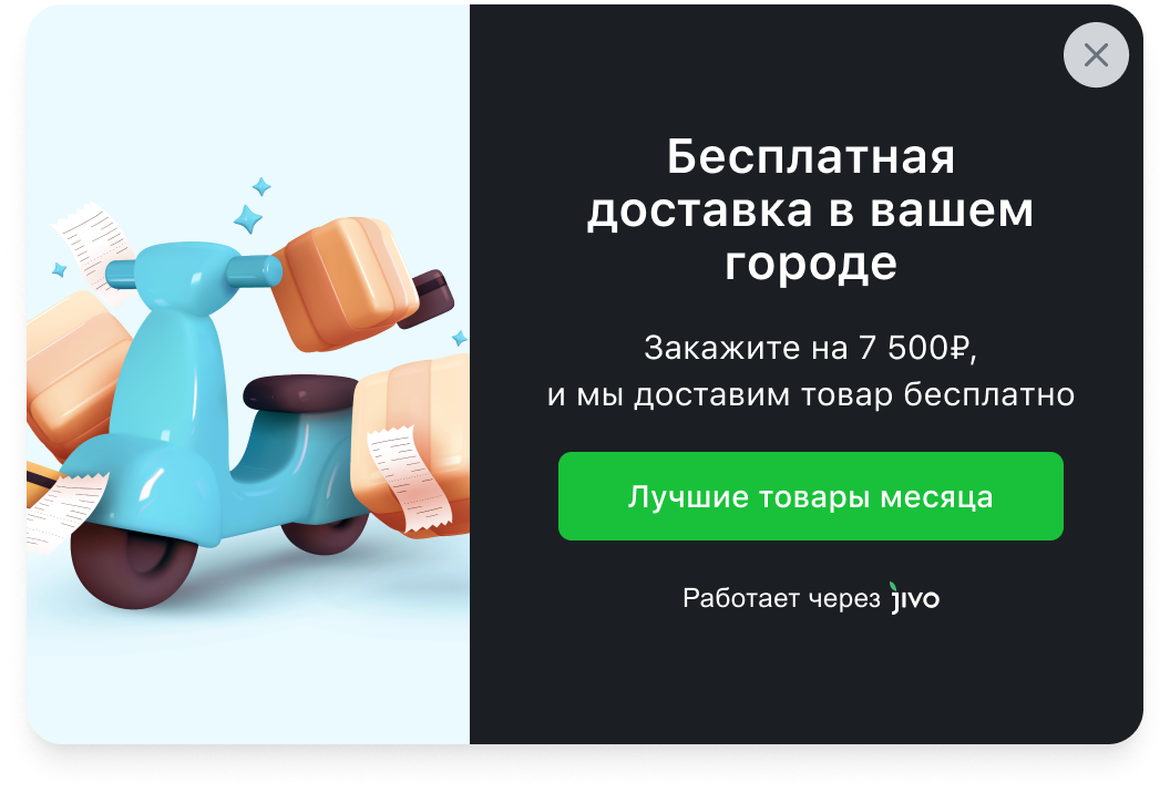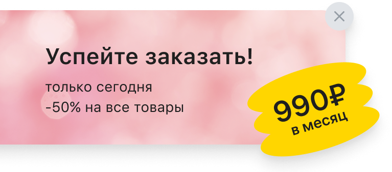 Неполадки на сайте, сложности с оформлением заказов, новый график работы или условия доставки — расскажите об этом во всплывающем окне и предложите решение проблемы. Так клиенты почувствуют вашу заботу и вернутся к вам за новыми покупками.