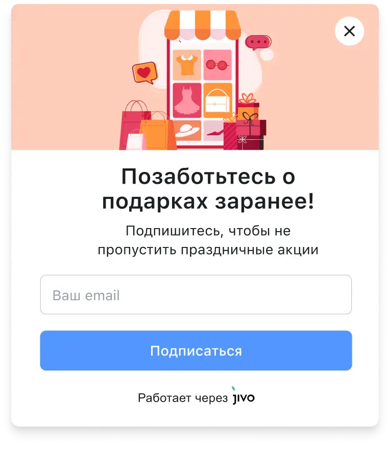 Рассылки — один из самых эффективных инструментов для увеличения продаж и удержания клиентов. Но чтобы конвертировать посетителя в покупателя с помощью рассылок, нужно получить его email адрес. Используйте всплывающие окна, чтобы потенциальный клиент оставил свои контакты за полезный бонус или просто так.