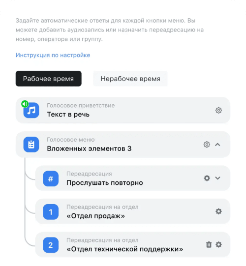 Используйте голосовое меню для снижения нагрузки при обработке входящих звонков. Клиенты сразу попадают в нужный отдел, сокращается время ожидания в очереди.
